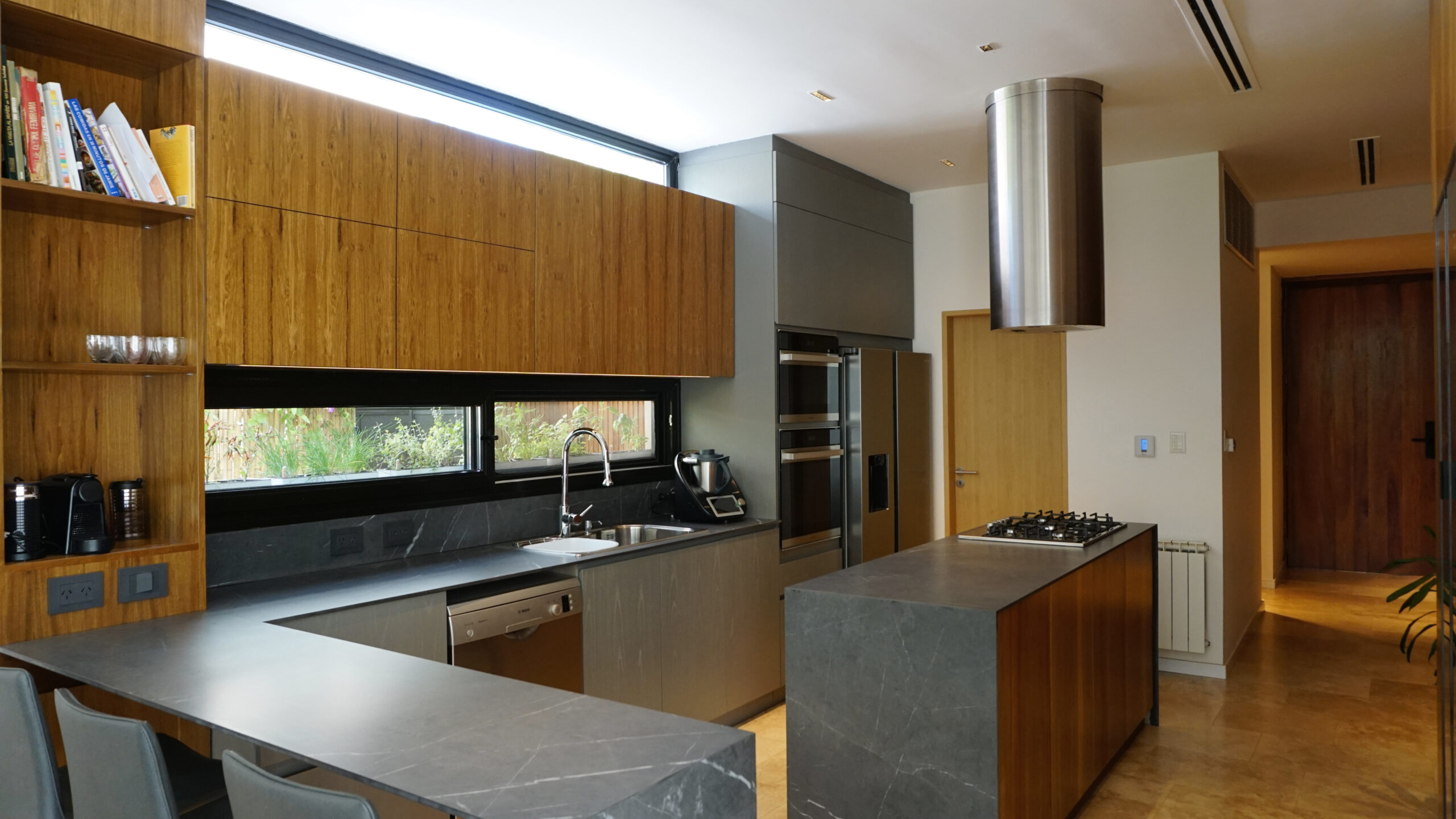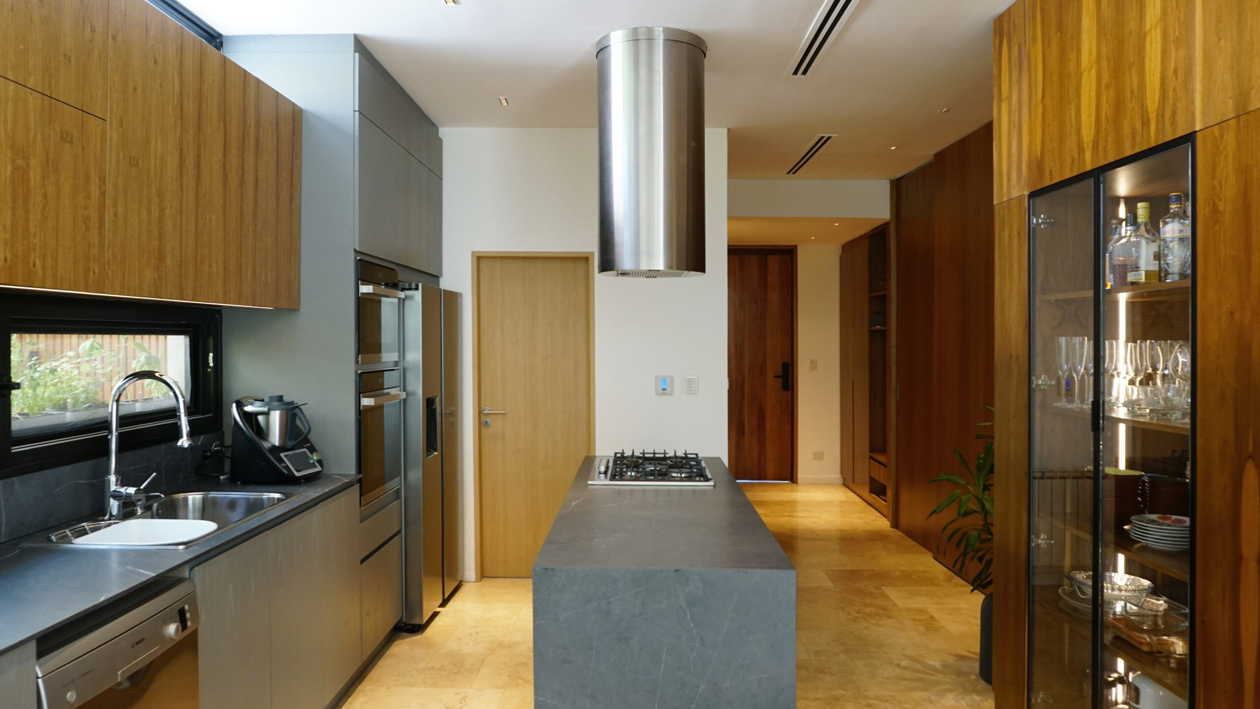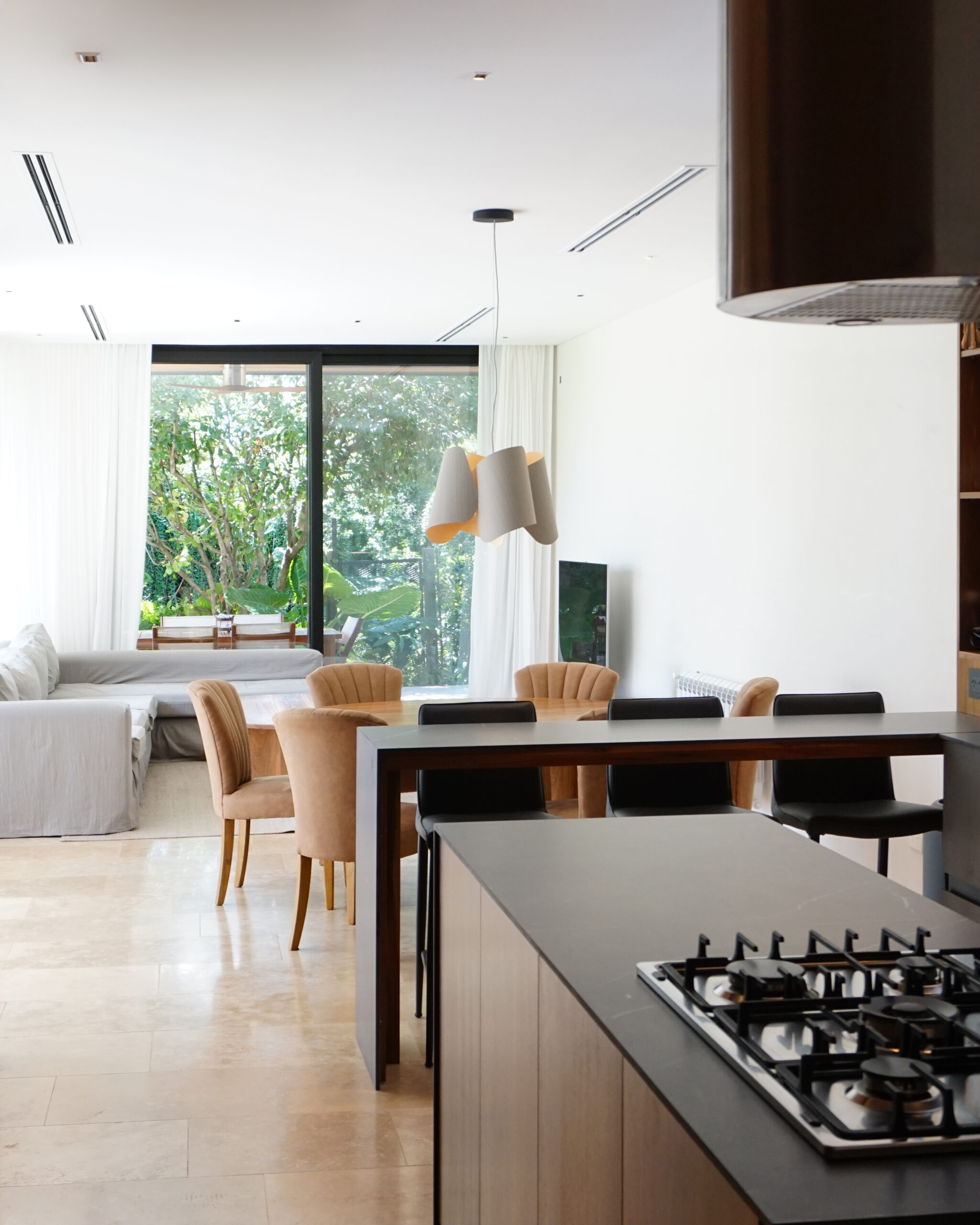 Desde la fachada de mármol travertino rústico hasta las aberturas con DVH, los muebles de petiribí realizados a medida, los sistemas de calefacción y aire centrales, cada detalle refleja una cuidadosa fusión de calidez y contemporaneidad. La adición de una nueva galería y una piscina revestida en piedra Bali amplía las posibilidades al aire libre, ofreciendo un oasis dentro del espacio doméstico. La galería se fusiona con el uso de la piscina, y las aberturas piso techo diluyen los límites del interior.